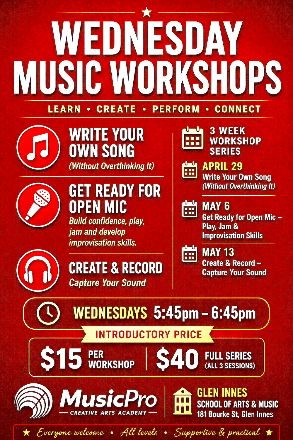 • MusicPro Masterclasses and Workshops: Evenings, Saturdays and Holidays